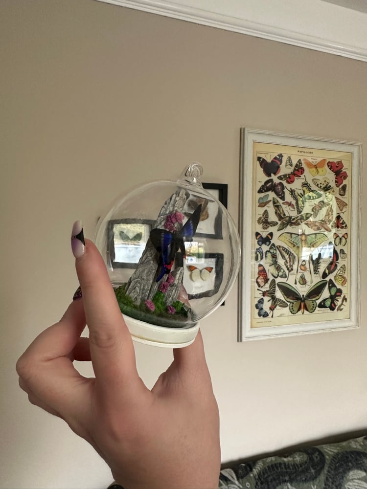 Blue Doctor butterfly in a mini dome sat upon a rock.