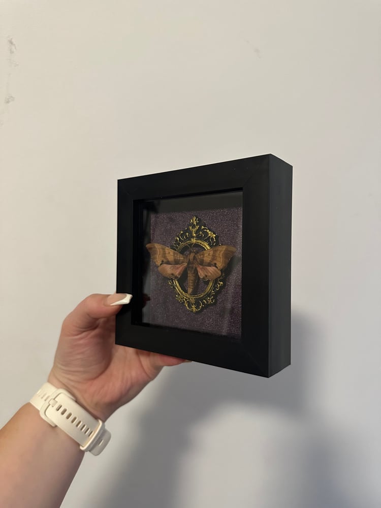 Gothic and elegant! This piece features a preserved Peach Sparrow Moth showcased against a deep purple velvet background, accented with an ornate golden frame motif. The black shadow-box style frame gives it a clean, modern finish.