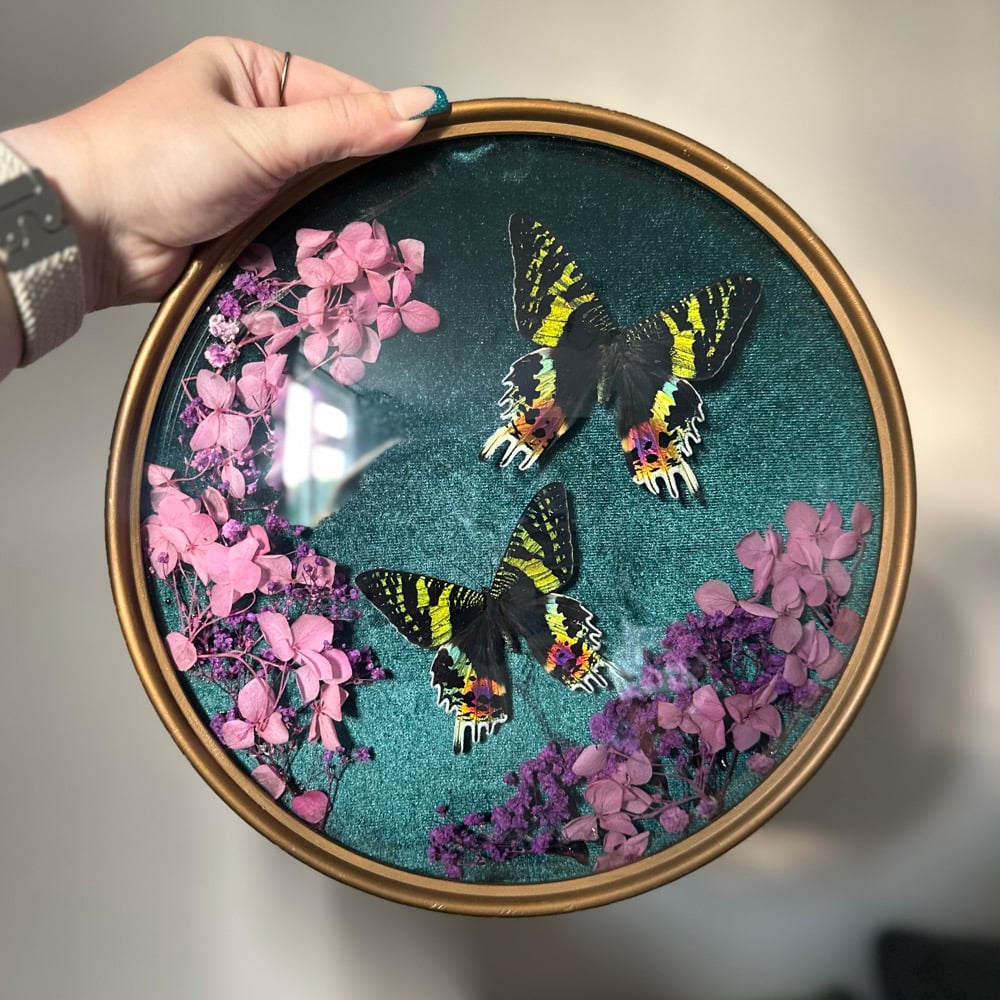 Vibrant yet haunting, these two Sunset Moths are preserved on forest green velvet in an antique frame —capturing their iridescent greens, fiery oranges, and inky blacks like stained glass kissed by twilight. A striking piece for any gothic gallery wall or lover of nature’s dark elegance.